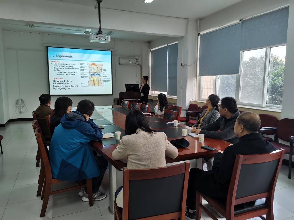 王溪副教授以“Ligament and osteoarthritis:Role of fibrillin-1”为题进行学术报告,简要介绍了膝关节韧带组成与功能及在骨性关节炎中韧带发生的病理改变包括细胞表型,软骨及黏液化生等。该研究主要通过fibrillin-1基因敲除小鼠模型,明确fibrillin基因缺失激活TGFβ促使小鼠韧带发生矿化、软骨化等异常改变并加速骨性关节炎进程的机制。研究发现,雄性小鼠模型中,出现韧带矿化、软骨化等异常改变,而雌性小鼠模型并未出现上述异常改变,这可能与雌激素可抑制TGFβ表达有关。王溪老师于2019年8月至2020年8月在英国利物浦大学老年病与慢性病研究所访学一年。