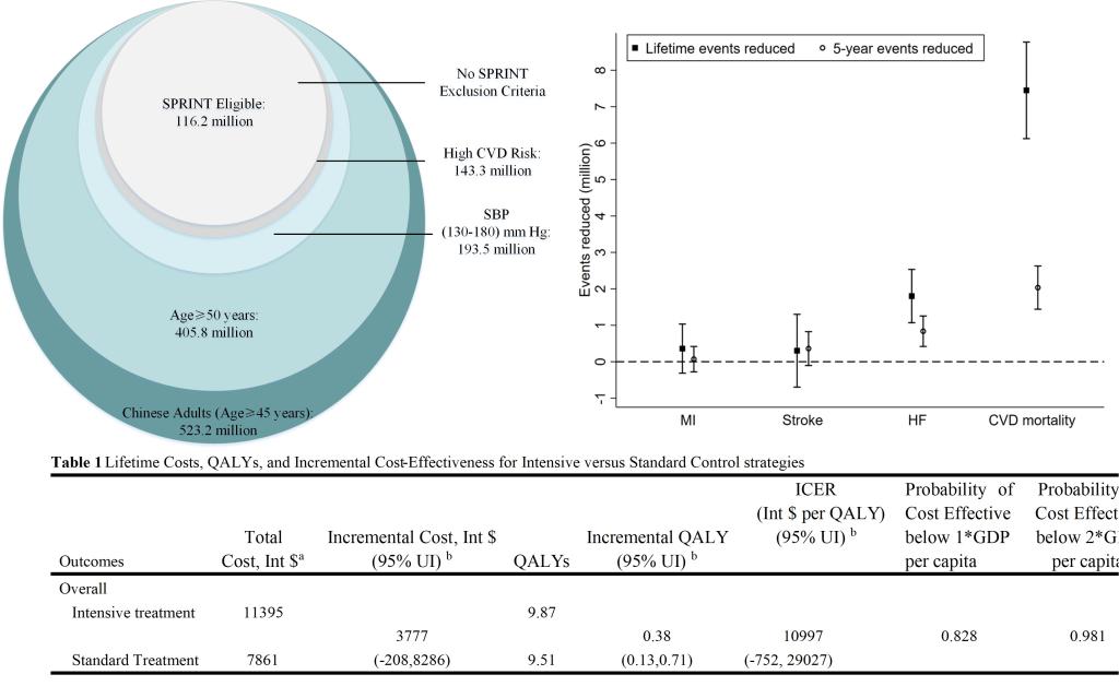 西安交通大学公共卫生学院李超副教授与利物浦热带病医学院陈涛副教授、王多劳教授团队开展深度合作,分析我国SPRINT研究人群规模并开展药物干预严格控制SPRINT人群血压策略的卫生经济学评价研究,结果显示:1、我国45岁以上人群中SPRINT适宜人群的规模和比例为1.16亿人(22.2%)。按我国目前的高血压防治指南标准,其中7720万人未纳入目前高血压管理人群范畴,且2660万人未接受任何降压治疗;2、采用药物干预严格血压控制对比现行指南在未来5年内将减少203万心血管相关疾病死亡并使我国全人口增加384万寿命年;3、对SPRINT人群采取严格血压控制措施将是一项极具性价比的策略,支付意愿阈值低于2017年中国人群GDP的概率为82.8%。该结果对我国重点高风险人群血压防控策略的制定具有重要意义。