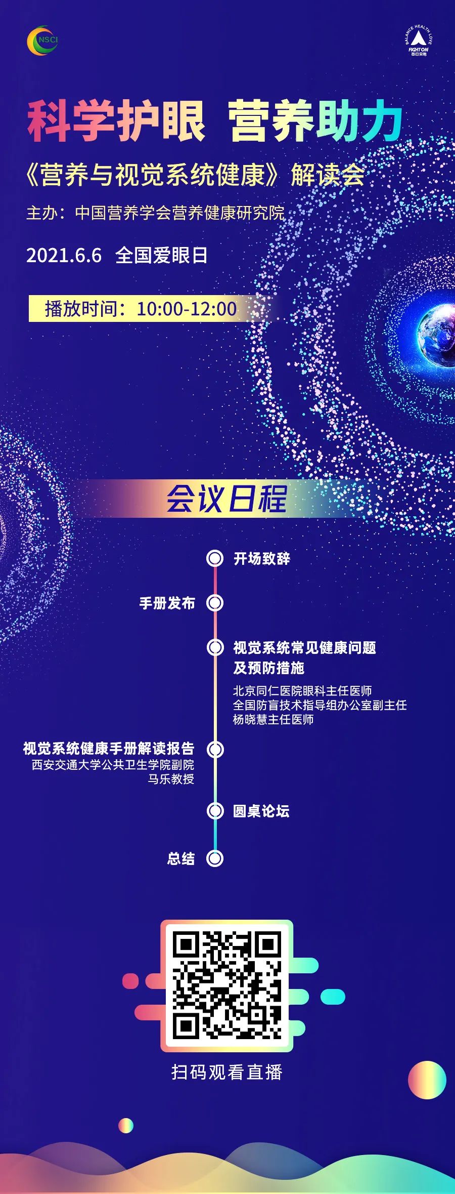 为响应国家卫生健康委办公厅和教育部办公厅联合印发的《关于开展2021年全国“爱眼日”活动的通知》号召,特此在6月6日“爱眼日”进行《营养与视觉系统健康》线上解读会,旨在进一步加强全民爱眼意识,提高民族健康素质。