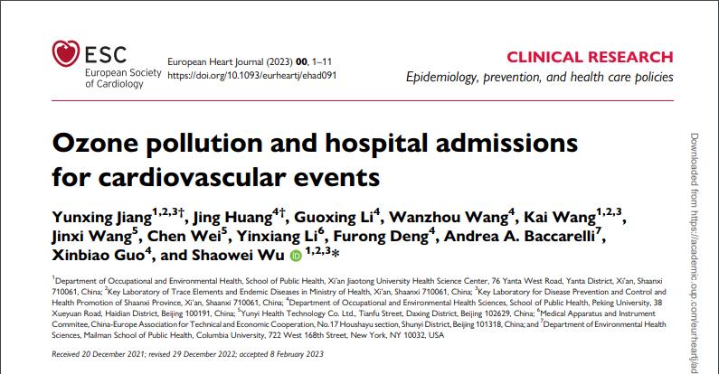 心血管疾病是全球疾病负担的主要贡献因素之一。尽管传统生活方式相关危险因素影响明显,但空气污染等环境危险因素的重要性越来越受到关注。近期公共卫生学院吴少伟教授课题组在心血管领域顶尖期刊European Heart Journal(欧洲心脏杂志,IF=35.86)以“Ozone Pollution and Hospital Admissions for Cardiovascular Events”(臭氧污染与心血管事件的住院风险)为题(论文链接:https://academic.oup.com/eurheartj/article-lookup/doi/10.1093/eurheartj/ehad091)发表关于环境大气臭氧污染急性暴露与心血管疾病住院风险的重要成果。