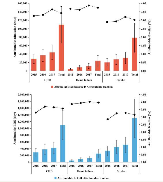 此外,研究期间,大气O3污染急性暴露导致的冠心病、心力衰竭和卒中住院人数的总体归因百分比分别为3.42%(95% CI: 2.08%, 4.75%)、3.74%(95% CI: 1.80%, 5.65%)和 3.02%(95% CI: 1.69%, 4.32%);且从2015年到2017年,大气O3污染急性暴露导致的主要心血管疾病住院人数和住院天数的年度归因比例和归因人数总体呈上升趋势,如冠心病、心力衰竭和卒中2015-2017年间的年度住院人数归因百分比递增区间分别为3.26%-3.64%、3.61%-3.85%和2.89%-3.20%(图2),为近年来大气O3污染导致心血管疾病负担增加提供了有力证据。