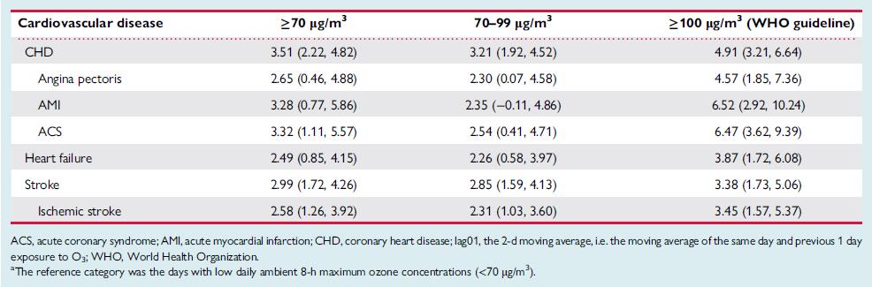 表1. 与每日8h最高O3浓度(2天平均值)超过一定限值对应的心血管疾病超额住院风险