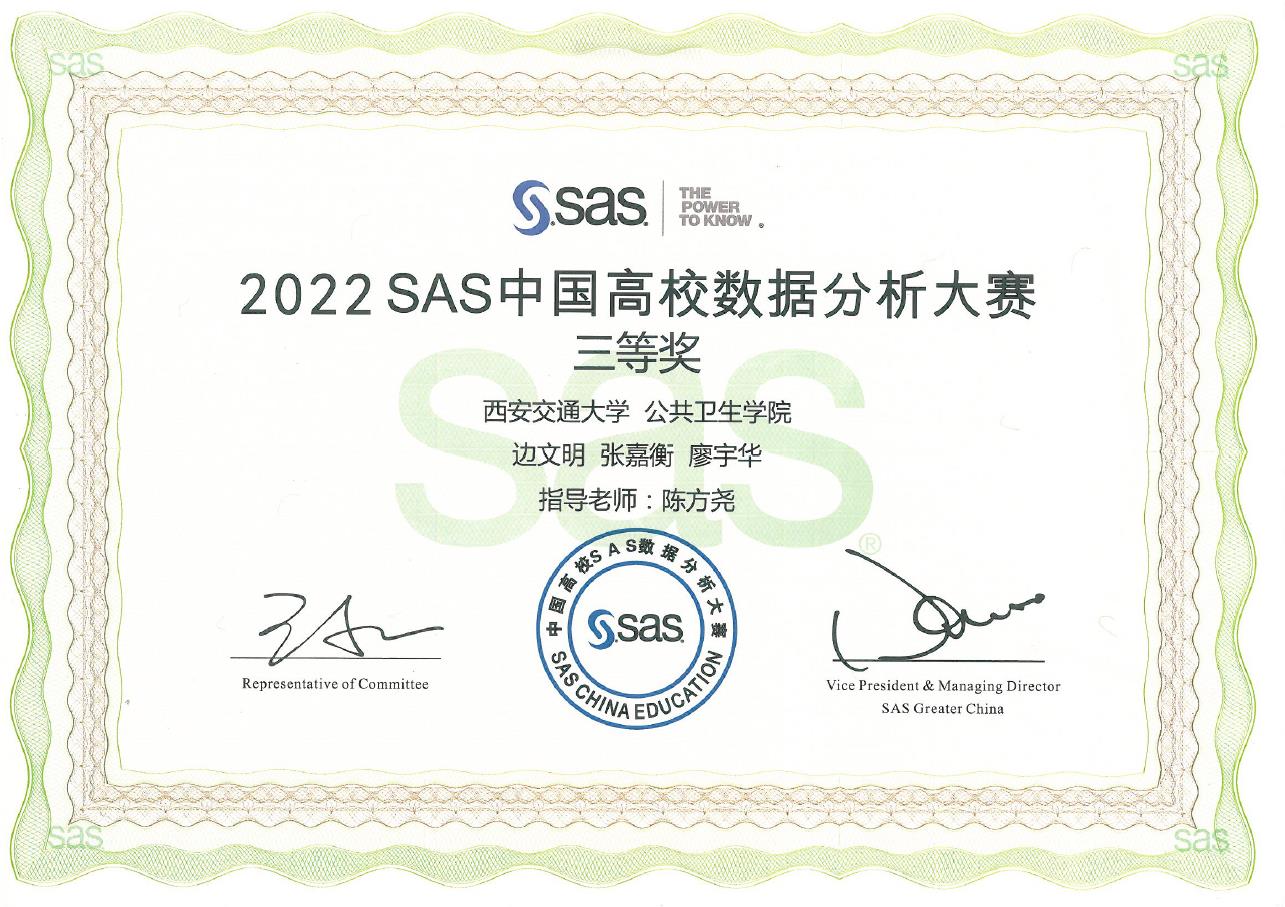 中国高校SAS数据分析大赛是由SAS中国公司发起的专门针对中国高校数据分析相关专业的一次非盈利性的公益大赛。本次大赛历时九个月,共有一千余支队伍参加,覆盖31个地区。初赛以参赛队伍网络答题的形式展开,共计五百余支队伍进入复赛。复赛以线上形式开展,分为数据分析报告撰写和数据拉力赛两个环节,依据两项综合评定,最后一百余支队伍脱颖而出,进入决赛。决赛分为线上报告和线下答辩两个环节,经过紧张的线下PPT展示和提问,决定最终获奖名单,公共卫生学院学子荣获大赛全国三等奖。