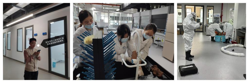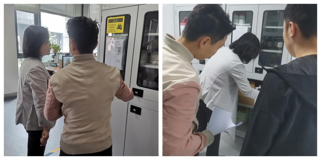 演练完毕后,韩蓓主任结合现场情况,与参演人员讨论分析各处置环节的不足,同时针对本次演练出现的安全隐患,对实验室各化学品储存试剂柜进行仔细检查。